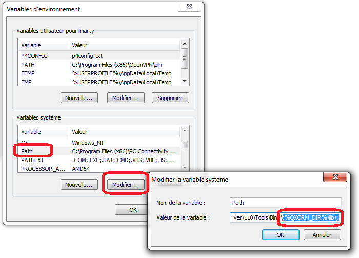 Modifier la variable syst�me � PATH � pour ajouter la valeur suivante : � ;%QXORM_DIR%\lib\; �