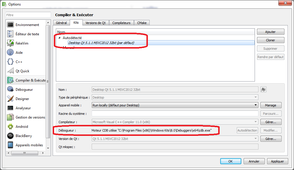 Si par d�faut, vous n'avez pas de d�bogueur param�tr� comme sur la copie d'�cran ci-dessus, veuillez installer � Debugging Tools for Windows SDK � disponible sur le site de Microsoft (http://msdn.microsoft.com/en-us/windows/hardware/hh852363.aspx). Ensuite, relancez QtCreator et vous devriez avoir � pr�sent :