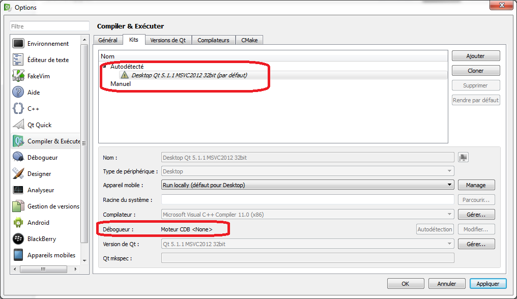 10- Tester QxOrm avec l'EDI QtCreator Pour ceux qui pr�f�rent utiliser QtCreator � la place de MSVC++ : lancer QtCreator pr�sent dans le dossier d'installation de Qt � .\Tools\QtCreator\bin\qtcreator.exe �. Ouvrir le menu � Outils >> Options �, puis aller dans la section � Compiler & Ex�cuter �, onglet � Kits �, pour v�rifier que c'est bien le compilateur de MSVC++ 2012 qui sera utilis� � la compilation dans QtCreator :