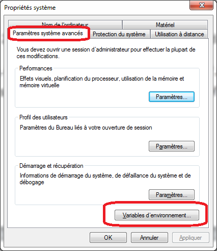 4- Ajouter le dossier � lib_shared � du package boost dans le � PATH � de Windows (optionnel) Remarque : cette �tape est optionnelle et non requise avec la configuration par d�faut : si vous ne souhaitez pas travailler avec les fonctionnalit�s propos�es par le module boost serialization, alors vous pouvez aller directement � l'�tape suivante de ce tutoriel. Allez dans les � Param�tres syst�me avanc�s � de Windows, puis cliquez sur le bouton � Variables d'environnements � :