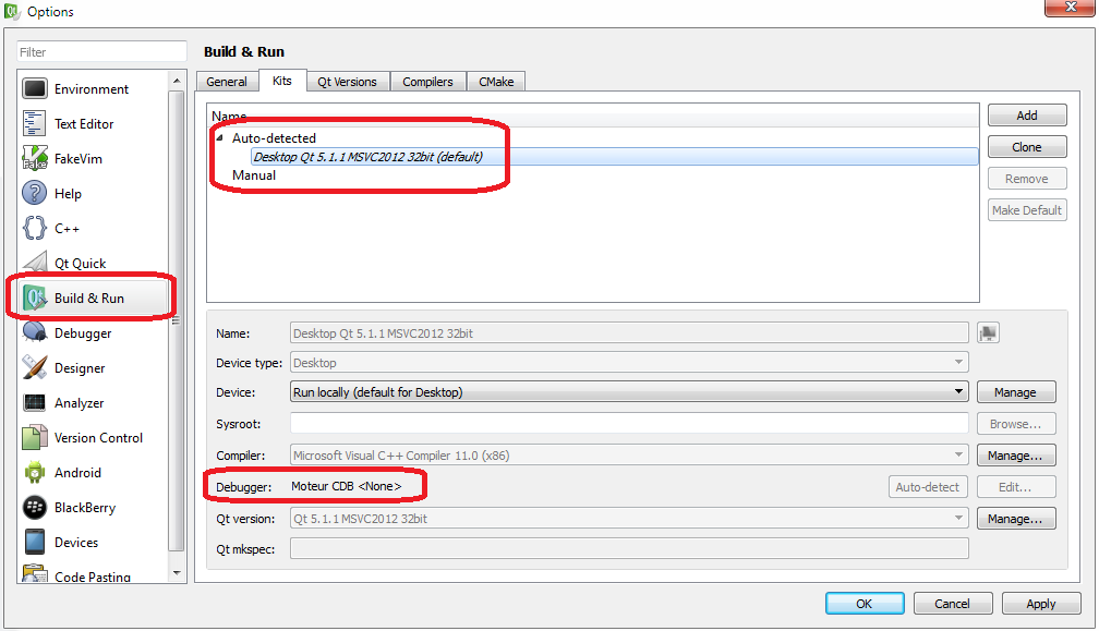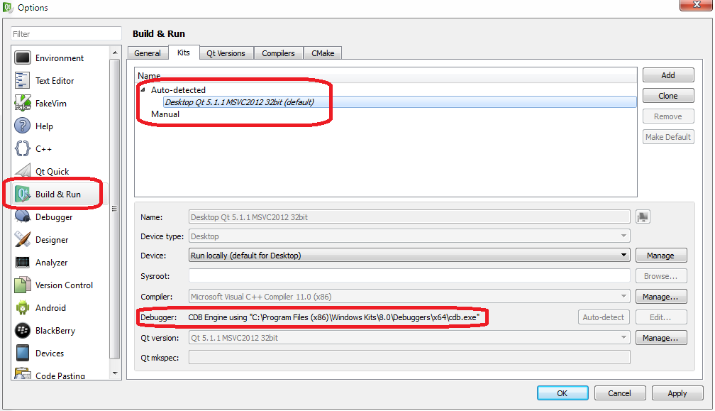 If QtCreator doesn't find any debugger (like the previous screenshot), just install � Debugging Tools for Windows SDK � available on Microsoft website (http://msdn.microsoft.com/en-us/windows/hardware/hh852363.aspx). Then restart QtCreator and you should have something like this :